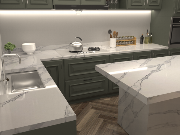 Quartz stone surfaces resist stains, heat, and scratch and are hard as granite.
